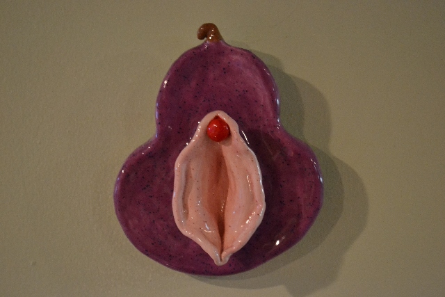 A midwife student contacted me recently to request I donate a labia sculpture for their table at the national midwife convention which was held in Portland last week. She’d seen my sculptures at the 2012 PSU production of the Vagina Monologues. Since she especially like my pears, I donated the Purple Pear with Pink Lips shown above. It was raffled to one of the teachers at the school.